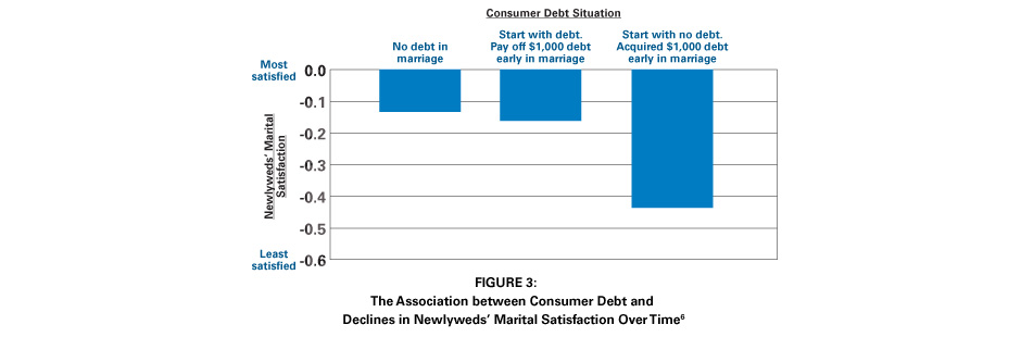 Research has shown that debt has the ability to erode the quality of married life over time. In a survey conducted by the Utah State University, USA6, it states that “consumer debt fuels a sense of financial unease among couples, and increases the likelihood that they will fight over money matters; moreover, this financial unease casts a pall over marriages in general, raising the likelihood that couples will argue over issues other than money and decreasing the time they spend with one another. For instance, as Figure 3 indicates, newlywed couples who take on substantial consumer debt become less happy in their marriages over time. By contrast, newlywed couples who paid off any consumer debt they brought into their marriage or acquired early in their marriage had lower declines in their marital quality over time.” If debt is unmanageable, seek the services of a financial consultant to develop a personalised debt repayment plan to regain control of your money.