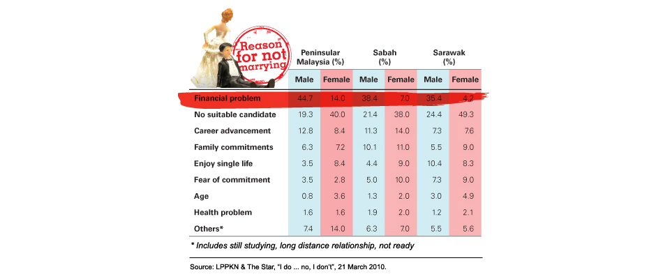 Not surprisingly, at the top of the list is financial problem. The survey indicates that almost one in two men in Peninsular Malaysia (44%) will marry late or not marry at all due to financial problems. As a parent, you may be faced with spoken or unspoken anxieties from your children with regards to the cost of married life. Similarly, parents may also have their own private concerns as they see their children struggle towards the next phase of their adult life.