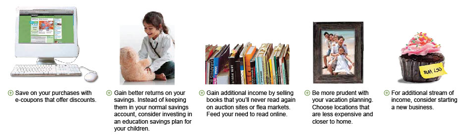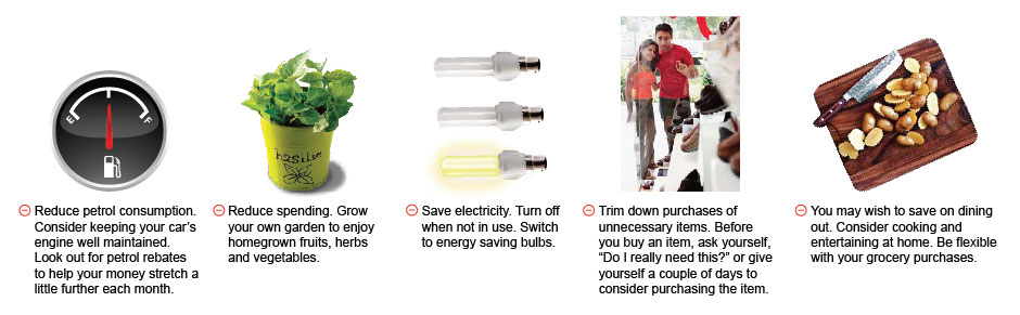 Pay off the big ticket items first, for instance, your home loan. Consider looking for a flexible home loan that allows you to make extra payments whenever possible. Even a small amount of an additional RM300 a month can make a big difference in reducing the amount of interest paid, irrespective of whether inflation is on the rise or not. It could save you on interest and allow you to continue enjoying other priorities in life. Don’t overbuy on what you need. You may need a TV but a 55” LED 3D TV has to be considered carefully as you may over commit your finances. Be smart with discretionary spending.