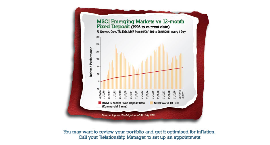 Do not dismiss stocks during times of inflation. However, the key is to choose the right stocks and perhaps aim to hold them for a longer term. Look for markets and companies that may benefit from inflation, e.g. selected equities from Emerging Markets and companies involved in commodities. These companies may see a rise in income as commodities prices rise during inflation. The chart below plots the growth trend of the Morgan Stanley Capital International Emerging Market (MSCI EM) indices versus returns from Fixed Deposits9. Over the long run, equities may offer returns that outpace the inflation rate.