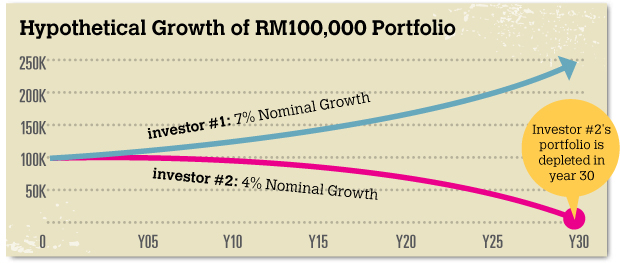 Investor #1 accounts for this and builds a portfolio with a nominal projected return (before inflation) of 7%. Investor #2 fails to consider inflation and builds a portfolio with a nominal projected return of 4%, which he believes is sufficient to cover the RM4,000 annual withdrawal (4% on a RM100,000 portfolio). As seen in the figure above, the second investor’s portfolio is depleted by year 30.3