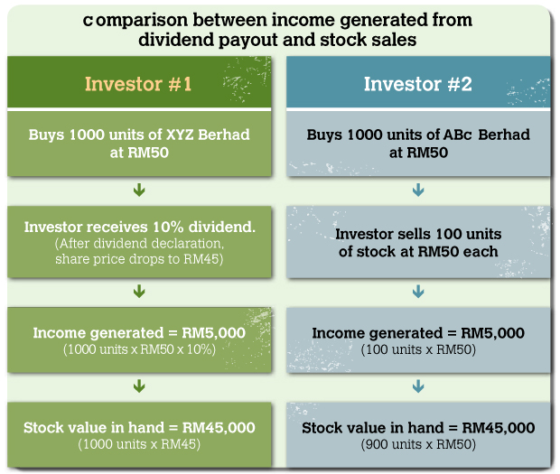 at two investors again. One chooses to generate income via dividend payout and the other opts to sell his stock.