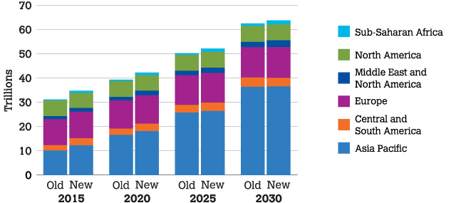 Asia’s position as the driver of global economy is a result of several key factors. The region’s economic development has given rise to a sizeable middle class population, which in turn is contributing to growth in “new economy” sectors such as consumption, healthcare and technology.10 It is expected that this growing middle class in Asia will drive increasing levels of consumption in the years ahead.12 According to some estimates, emerging Asia’s middle class spending will far surplus that of North America, Europe and the rest of the world at over US$30 trillion by 2030.12