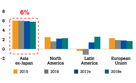 growth prospects, Indonesia’s expansion in capital spending to sustain economic growth, and Korea’s corporate governance reforms to pave the way for better shareholder returns will also drive growth.10 Forecasts expect Asia to enjoy higher GDP growth in the 6% region through 2018 compared to the rest of the world.10