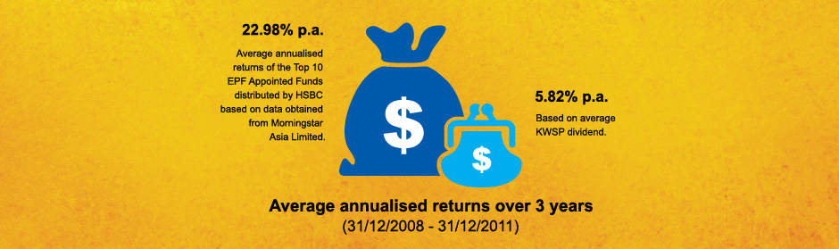 The diagram below shows the average annualised returns of the Top 10 EPF Appointed Funds distributed by HSBC and the average KWSP dividend over 3 years.
