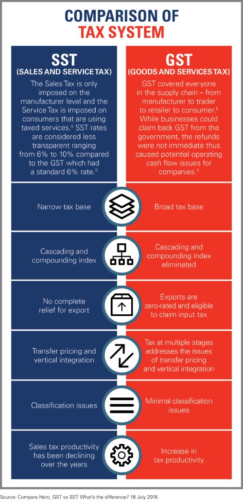 In comparison, the 6% GST was a blanket tax system which was imposed on every tier of the supply chain from the start until it reached the end-consumer.4 Therefore, the longer the line of supply chain, the larger the amount of tax imposed, and the higher the price of goods when it reached the end-consumer.4