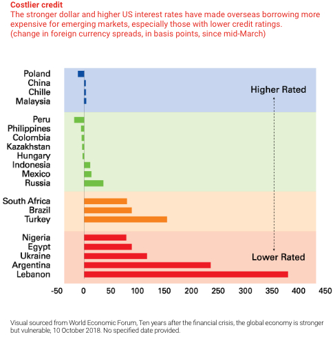 Beyond escalating trade tensions, the US has also had a role to play in the increasing pressures on emerging market economies in 2018.1 The stronger US Dollar and higher US interest rates have made overseas borrowing more expensive for emerging markets, especially those with larger credit needs and weaker economic conditions or policy frameworks.1