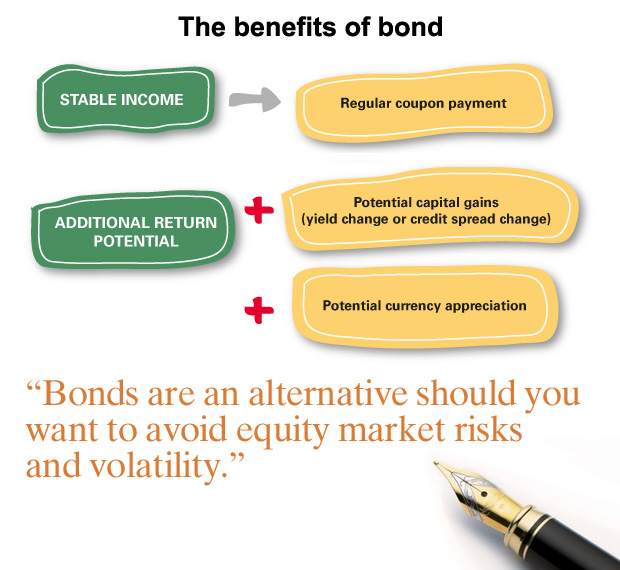A bond is a debt security issued by a corporation or government, with a stated interest rate and specified dates when interest and principal must be paid. In a nutshell, bonds are an instrument for companies to “borrow” money by issuing bonds to investors to fund their working capital requirements or for business expansion purposes. In return, the investor receives coupon payments (interest) periodically and the principal value of the bonds at maturity provided there has not been any default by the issuer.