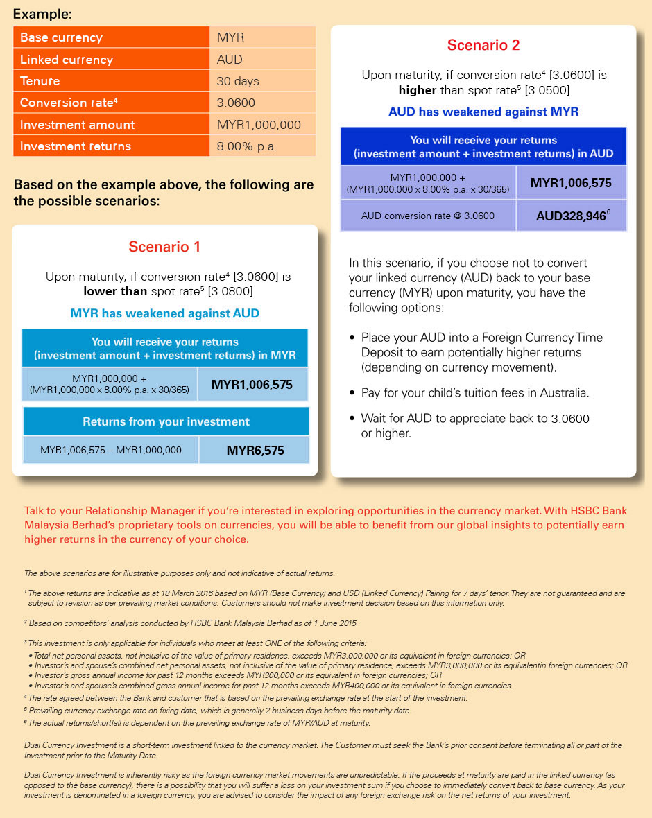 DCI is also a good investment instrument to consider if you use foreign currency regularly for business interests abroad or to fund your child’s overseas education. Even if your child is due for college in the next few months or even a few years down the road, DCI can help you capitalise on currency movements to accumulate the currency you need.